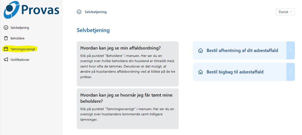 På selvbetjeningen for affald kan du se, hvornår din beholder bliver tømt næste gang. Du kan også se din tømmekalender for hele året og tilmelde dig SMS-service for husstandsindsamlingen.