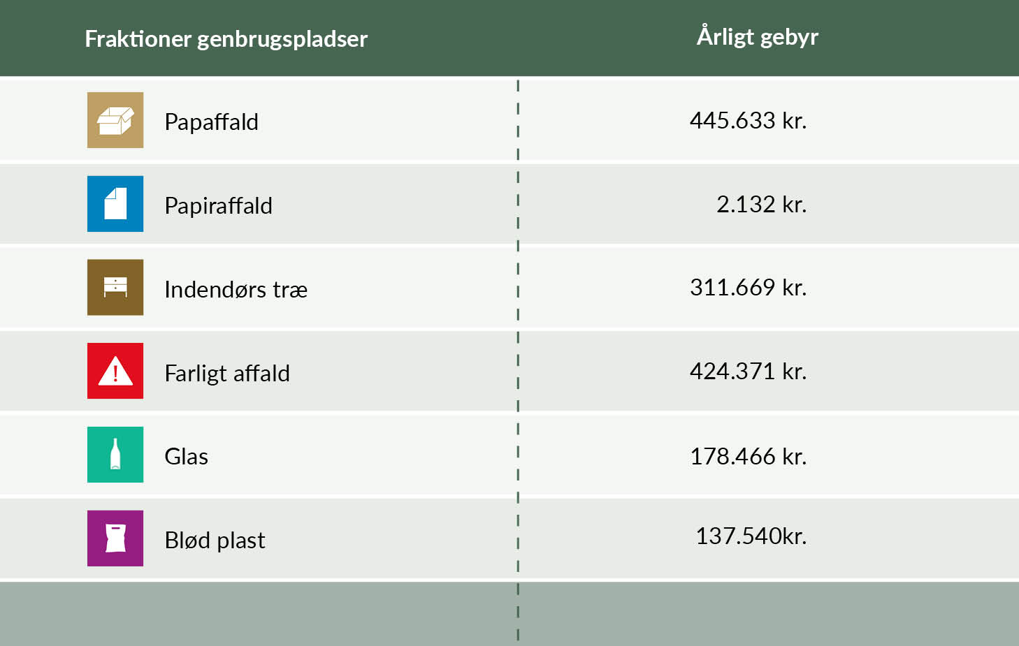 Nedenstående to tabeller viser Provas' opgørelse over gebyrer i 2025 til producenterne eller disses kollektive ordninger. Priserne er eksklusiv moms.